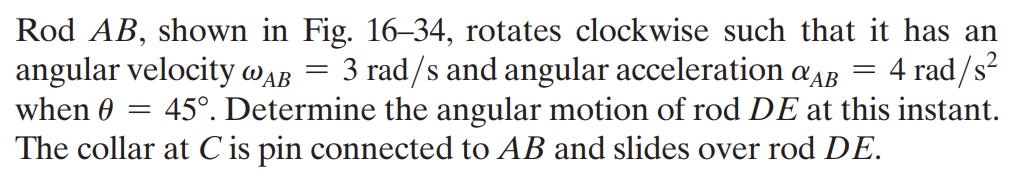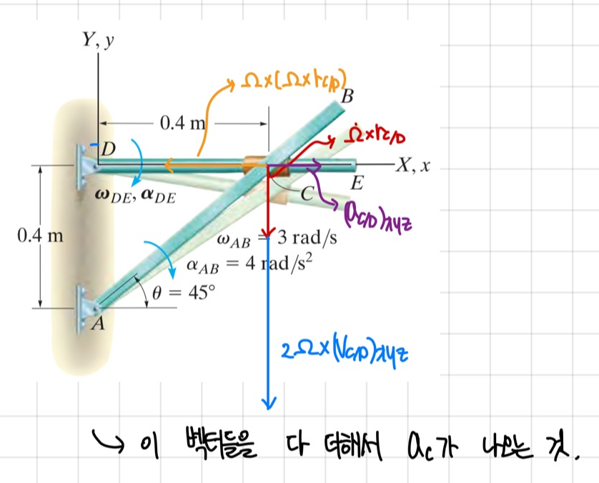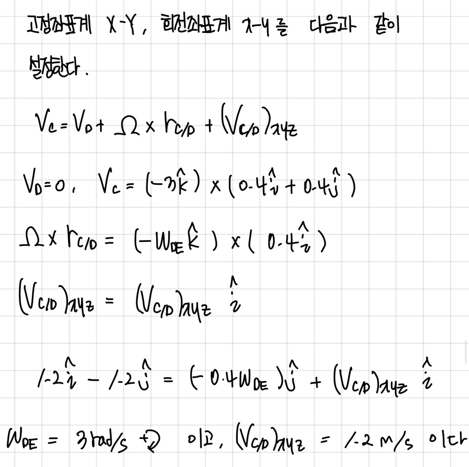 점C의 속도를 rodAB를 통해 구할 수 있다. 그리고 D점에서 본 C의 상대속도의 방향또한 알 수 있다. 한번 상상해봐라. 당신이 점 D에서 rodDE와 같이 회전한다고 상상해봐라. C의 상대속도는 어떻게 되는가? (Think Hard)