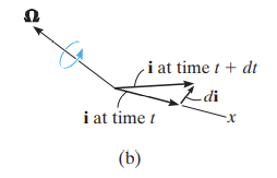 미소시간 $dt$동안 좌표계가 미소각도만큼 회전했을 때에 변위는 $di$로 나타낼 수 있다. 단위벡터이기 때문에 크기는 1이고, 방향은 $j$방향입니다.