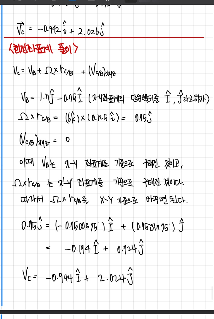 그리고 B에서 본 C의 상대속도((V_C/B)xyz)가 0인 이유는 C점은 회전만 하기 때문입니다. 회전좌표계는 같이 회전하기 때문에 회전좌표계내에서는 회전을 알 수 없고 2번 문제처럼 앞으로 왔다 갔다 하는 것만 알 수 있습니다.