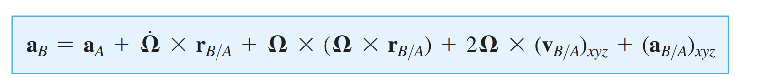 $(V_{B/A})_{xyz}$와 $(a_{B/A})_{xyz}$는 회전좌표계 안에있는 A점에서 본 B점의 속도와 가속도이다.