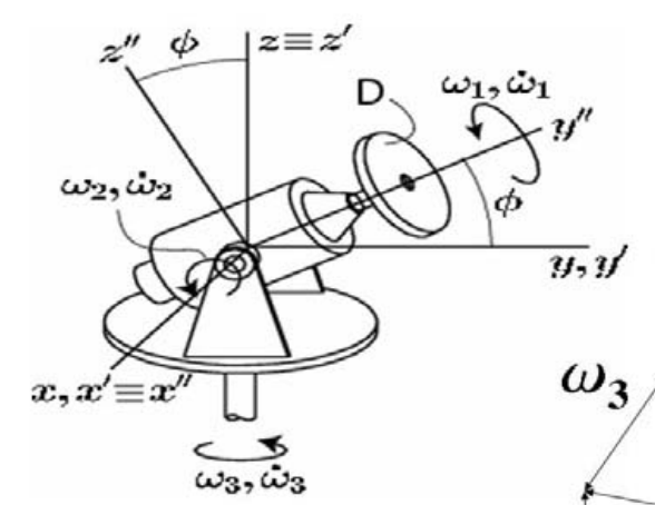 예를 들어, 3개의 축으로 회전하는 강체가 있다고 생각해봅시다. 이때D점이 놓여있는 원판(disk)는 $\omega_1$, $\omega_2$, $\omega_3$의 영향을 받습니다. 하지만 y''에 놓여있는 점은 $\omega_3$,$\omega_2$의 영향만을 받습니다.