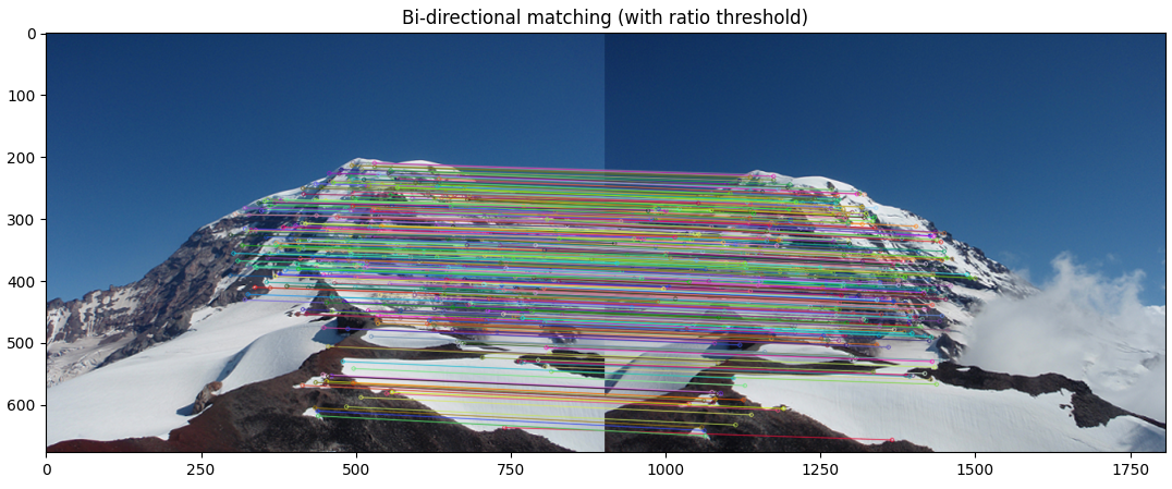 최종적으로 특징점을 찾아 매칭하는 목적은 image stiching을 해보기 위함이므로, 두 이미지간의 모든 특징점을 빠짐없이 찾을 필요는 없다. 확실한 것만 고르면 된다. 따라서 Nearest Neighbor search, Ratio Test, Bi-directional consistency test와 같은 방식을 사용해 아닐거 같은 것은 제거한다.