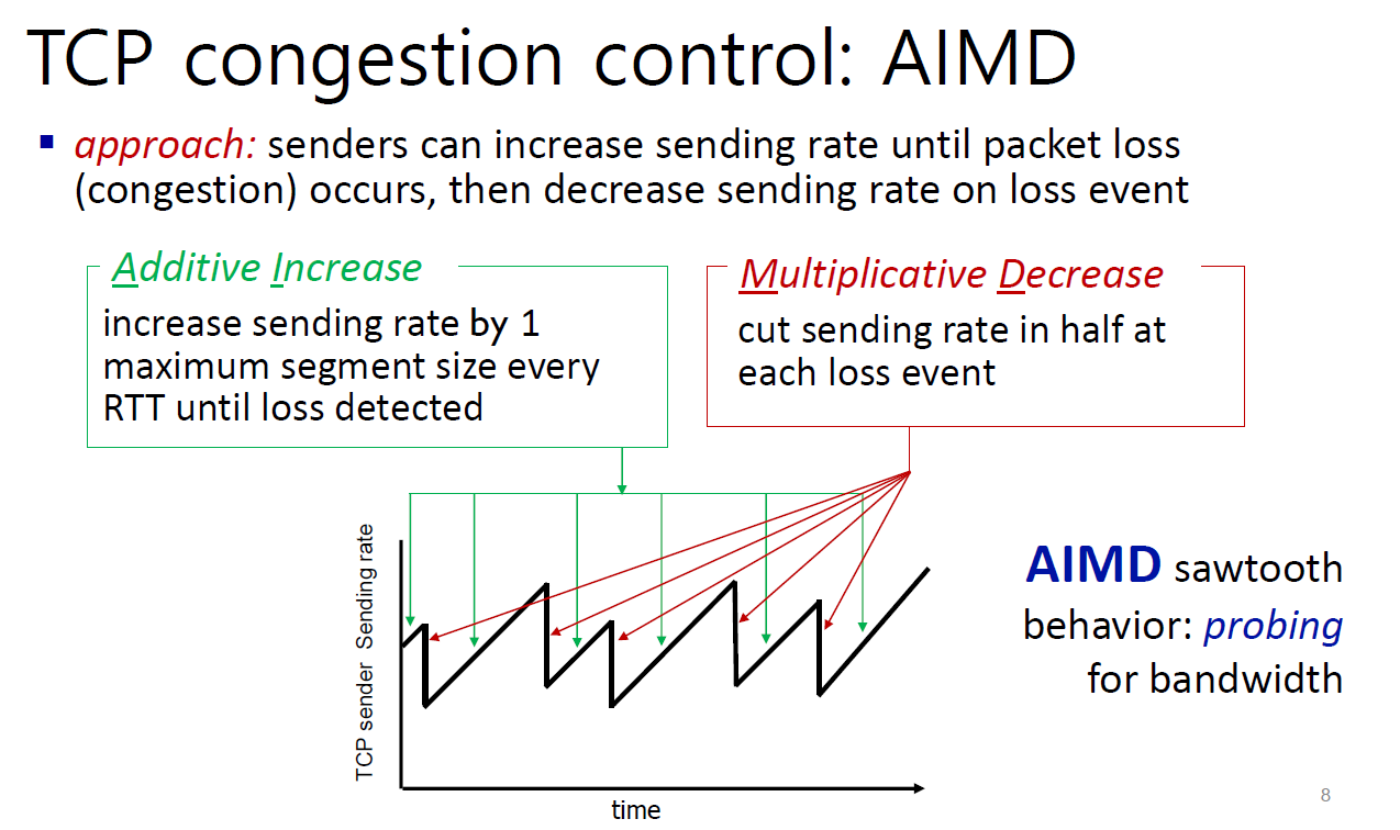 흐름제어의 주체가 수신 호스트라면, 혼잡 제어의 주체는 송신 호스트이다. 흐름제어에서 사용되는 윈도우의 크기는 수신 호스트로부터 받는 값이지만, 혼잡 제어에서는 얼마나 혼잡한지를 라우터가 알려주지않기에 호스트가 대충 때려맞춰서 얼마나 보내야할 지 계산해야한다. 얼마나 보낼지에 대한 정보가 혼잡 윈도우이며, 이걸 계산하는데 사용하는 가장 기본적인 알고리즘이 AIMD(Additive Increase/Multiplicative Decrease)이다. 이 알고리즘은 간단한다. loss가 없을 때까지 선형적으로 전송율을 올리다가 loss가 감지되면 확 줄여버린다.