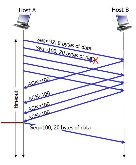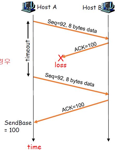오른쪽 사진은 ACK 100은 도착하지 않았지만, Timeout전에 ACK 120이 도착해서 그 전의 세그먼트도 잘 도착했구나라고 판단하는 시나리오(재전송 X) -> TCP는 Cumulative ACK이라는 점!