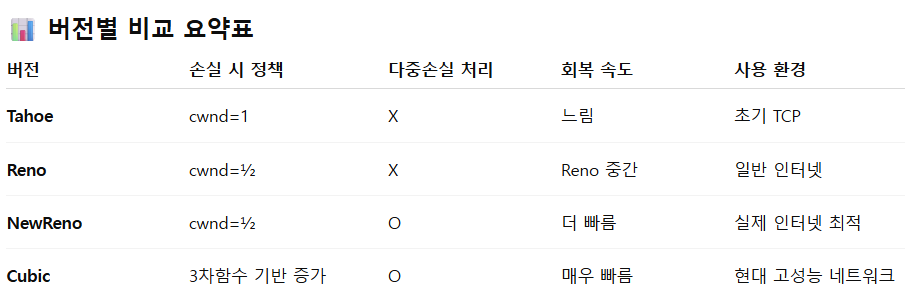 TCP의 주요버전으로는 TCP Tahoe, Reno, New Reno, Cubic이 있다.